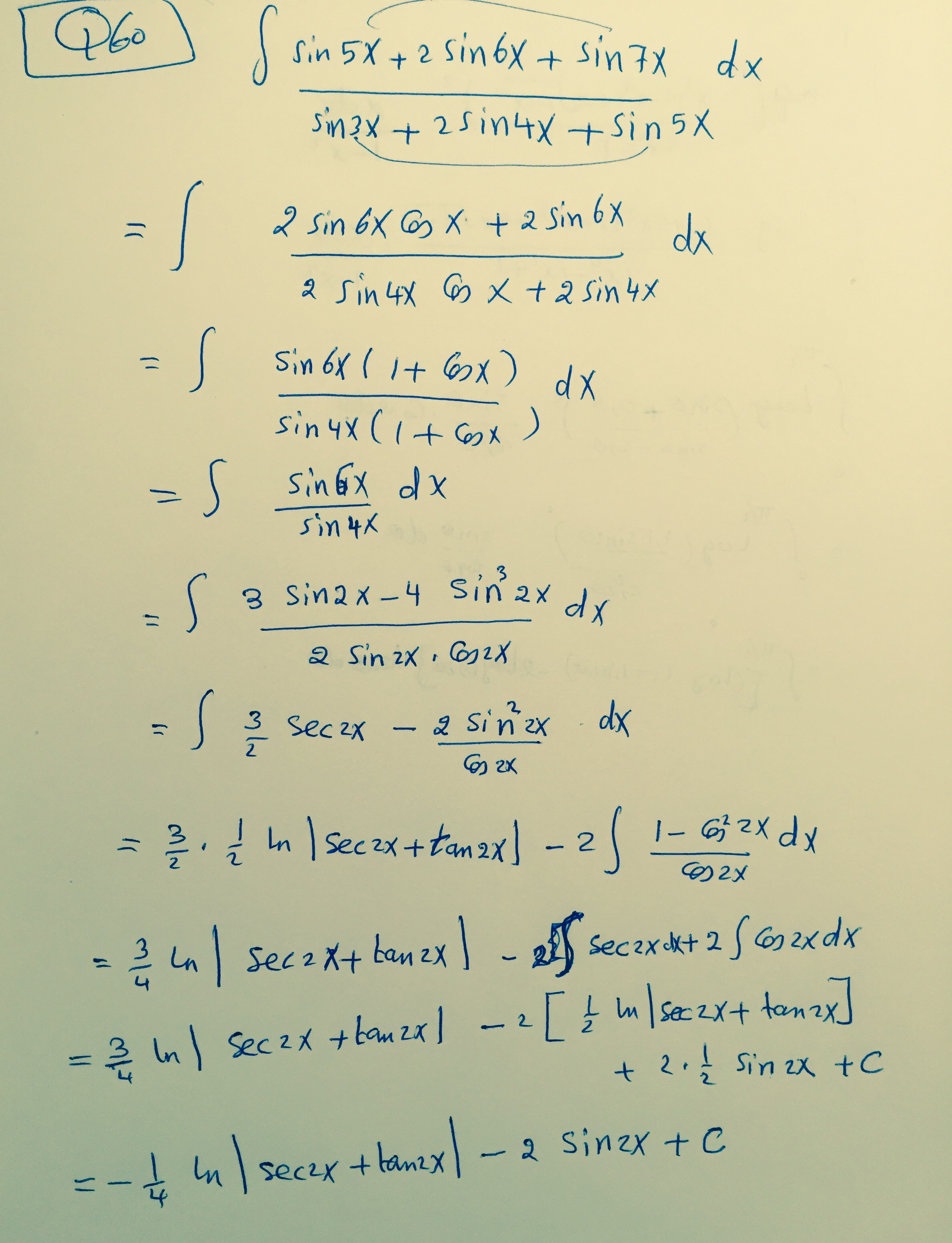 $Q60)\int \frac{sin5x+2sin6x+sin7x}{sin3x+2sin4x+sin5x}dx$
