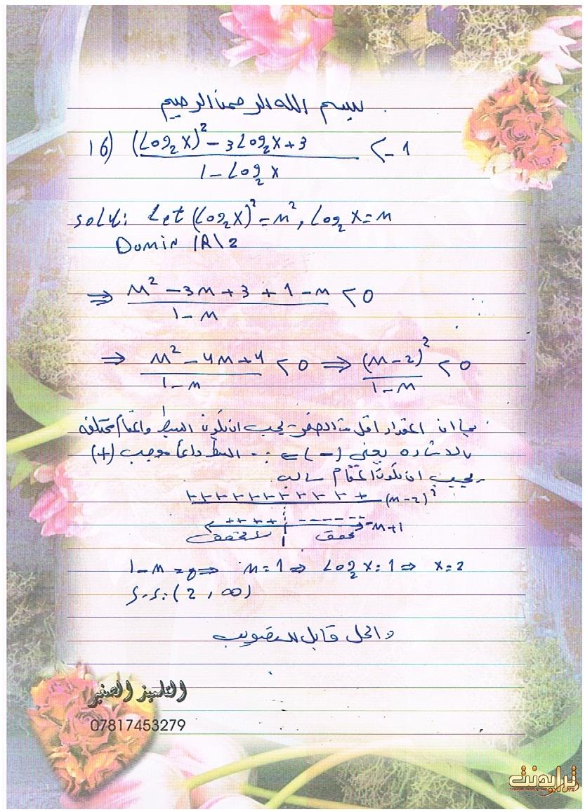 السلام وعليكم استاذي كامل الناصري أرجو وأتمنى ان تتفضل علينا بشرح موجز على التراجحات والقيمة المطلقة لحل هكذا أسثلة لنستفيد من خبرتكم في هذا المجال ولكم الشكر والمحبة