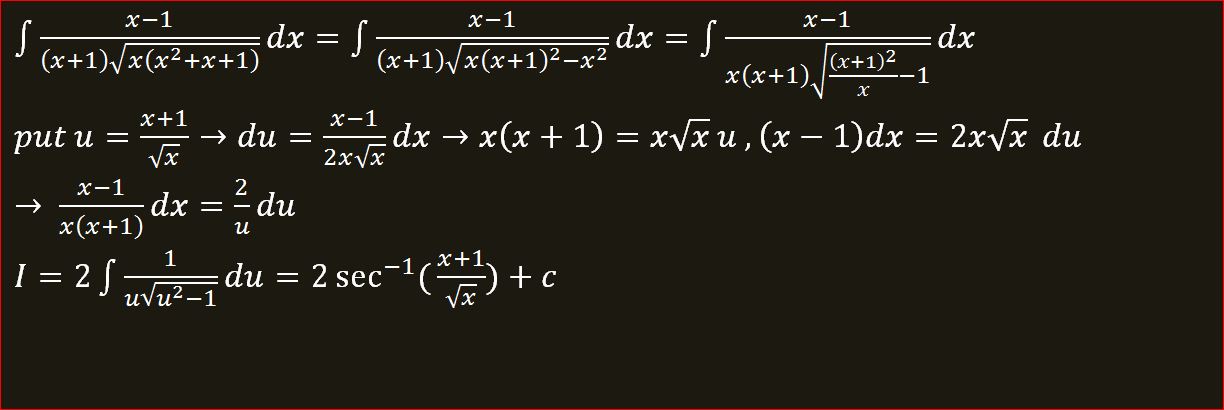 \[\huge {\color{Red} {\color{Red} \int \frac{x-1}{(x+1)\sqrt{x(x^2+x+1)}}dx}}\]